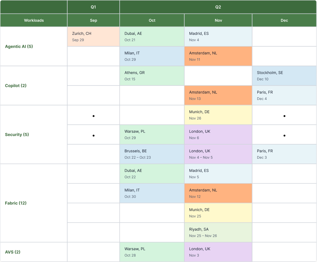Take part in in-person skilling events across EMEA and strengthen your technical and business expertise with Microsoft. Each session is designed to provide practical guidance, peer collaboration, and hands-on learning to help you accelerate customer success.